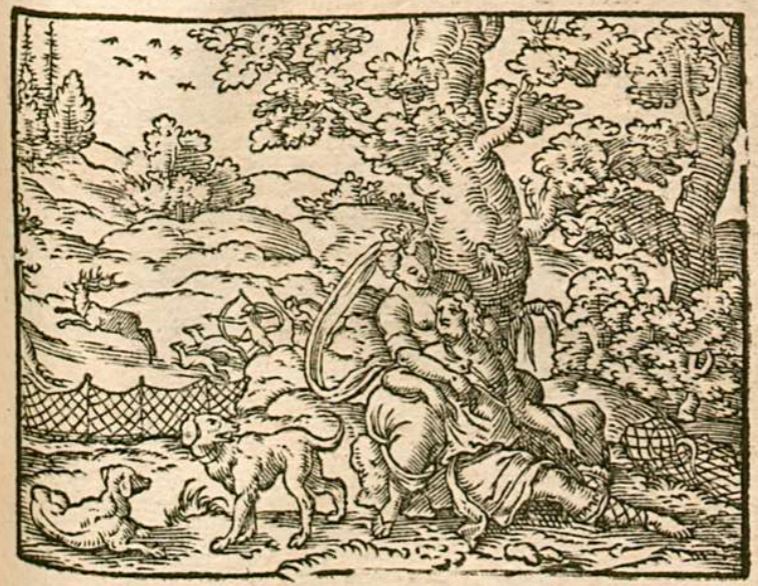 This engraving illustrates the goddess Venus sitting on the ground as she holds her new lover, Adonis. They are illustrated looking lovingly at one another as Adonis’ hounds rest beside them. Venus had been admiring Adonis from afar when her son Cupid had accidentally scratched her with one of his arrows. The arrow caused her to fall in love with Adonis. She decides to abandon her love of watching over her cities and she forgets the heavens all to focus on Adonis. They roam the forest and hunt together, which is depicted in the background of the engraving.