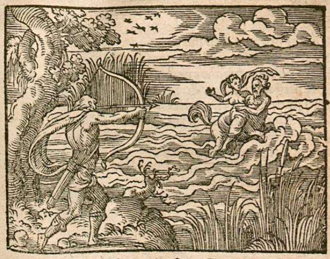 Hercules and his new bride Deianira came across the Evenus River while on their way back to Hercules’ native land. The river was higher than normal and dangerous to cross. A centaur named Nessus appeared and offered to carry Deianira safely across the river. Hercules misplaced his trust, as after he crossed the river, he turned back to realize that Nessus was stealing his new bride. Deianira is illustrated in the arms of Nessus, with her hand reaching to Hercules on the shore imploring him to save her. Hercules is depicted with his bow and arrow as he uses his archery skills to strike Nessus down and save his wife.
