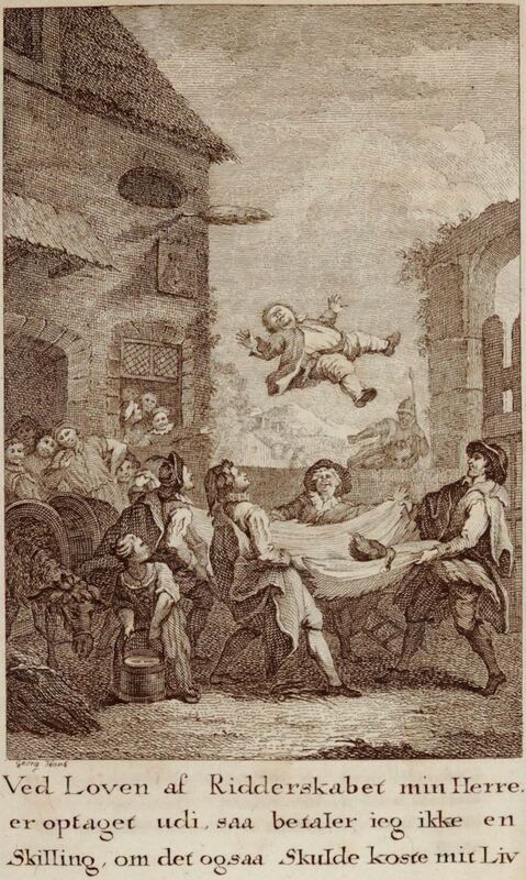 When Sancho Panza refuses to pay the innkeeper, guests at the inn toss him in a blanket in the courtyard and make merry with him. Among the guests are four wool carders from Segovia, three needlemakers from El Potro in Córdoba, and two residents of La Feria in Sevilla. In the background, Don Quixote looks on from behind the inn wall. Signed by J.-J.-G. Haas (engraver). Part 1, ch. 17.