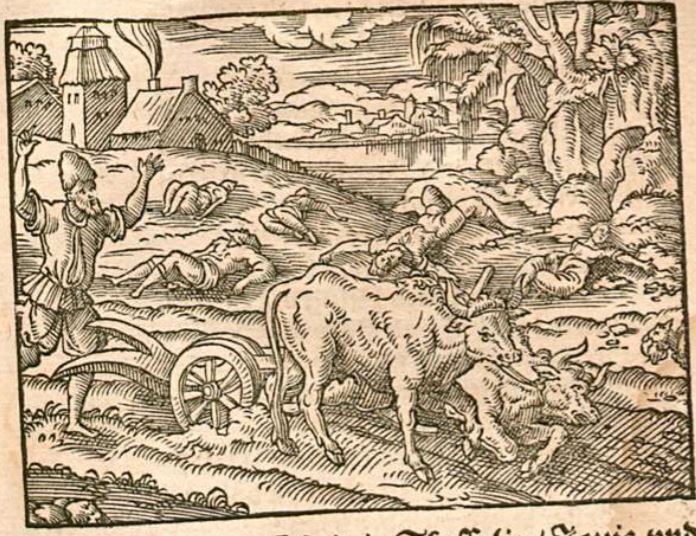This engraving illustrates the plague that ravaged in Aegina. King Aeacus of Aegina recalls this story to Cephalus and explains that the plague hit Aegina due to Juno being jealous that the island was named after Aeacus’ mother. There are people depicted throughout the engraving that have fallen and died due to the epidemic. Humans were not the only ones affected by the plague, as most of the animals had perished as well. The man illustrated with his arms in the air is the farmer of the oxen that have collapsed. He is showing his dismay at the tragedy that surrounds him.