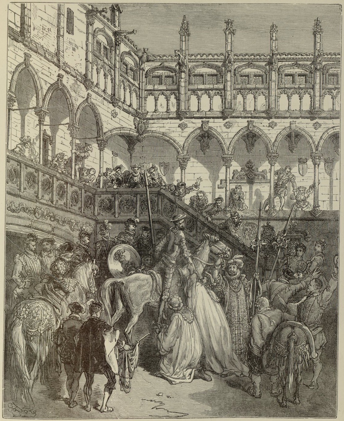 In the palace courtyard, two well-dressed lackeys help Don Quixote to dismount, followed by Sancho Panza and the duchess. Signed by G. Doré (illustrator) and H.-J. Pisan (engraver). Part 2, ch. 31.
