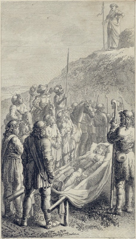 Marcela appears on a crag overlooking Grisóstomo’s burial (centre of the composition). Ambrosio, Grisóstomo’s friend, stands near his body. He accuses Marcela of causing the death. The scene is observed by Don Quixote, Sancho Panza, the gravediggers, and several goatherds. Signed by D.-N. Chodowiecki (illustrator) and D. Berger (engraver), dated 1779. Plate 3. Part 1, ch. 14.