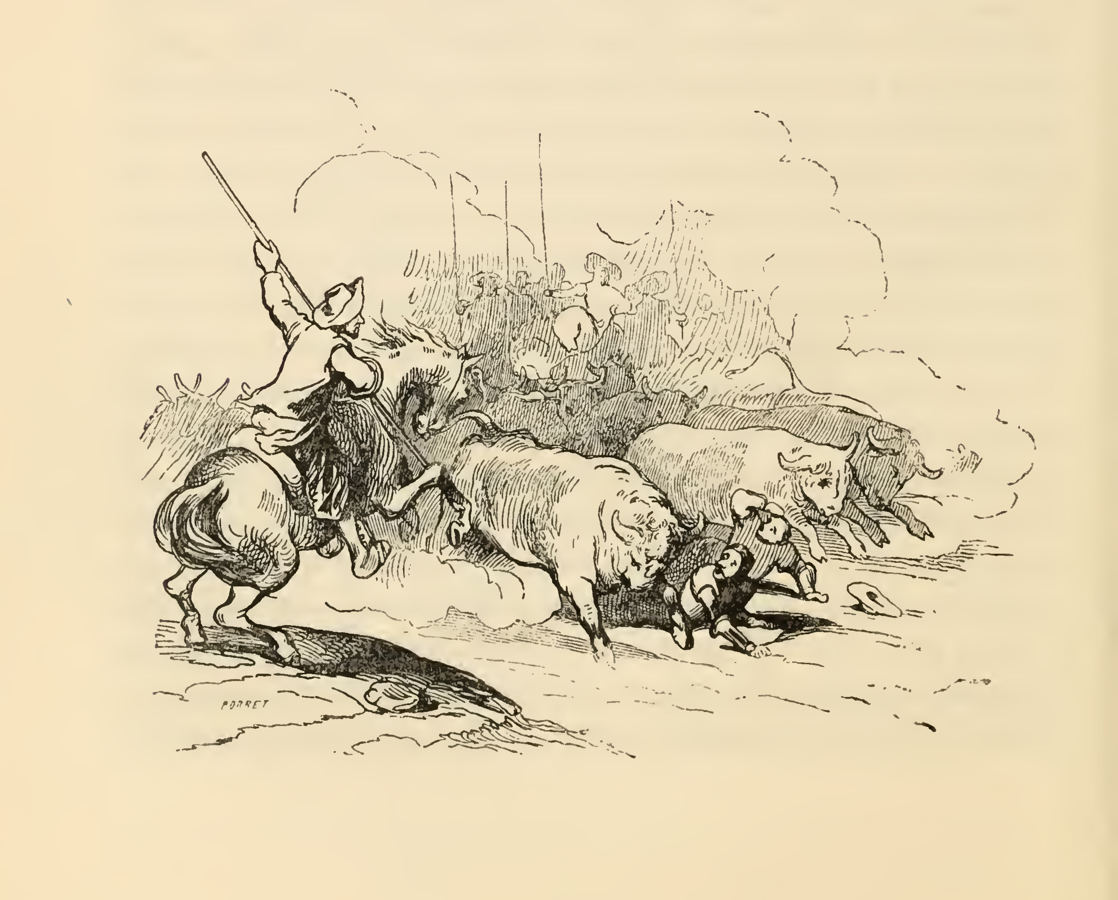 Having planted himself in the middle of the highway to Saragossa, Don Quixote is confronted by a stampede of bulls. A man with a lance in his left hand rears his horse (left) and tells Don Quixote to get out of the way of the whole herd of fierce bulls. The stampede of bulls is headed by three large bulls with powerful horns. In the background a group of herdsman equipped with lances follows behind the stampede. Don Quixote, clad in armor tries to crawl away from the herd while Sancho covers his head which is no longer covered by his hat for that has flown a little ways further down the road.