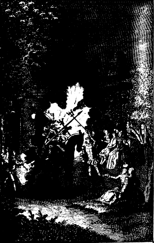 The Duke and the Duchess prepare a wooden horse for Don Quixote so that he may enter into single combat with the giant Malembruno halfway across the country. They explain that the wooden horse which they call Clavileno will transport themthrough the air to the place where Malambruno attends their coming. However, the condition is that they must blindfold their eyes, or else the dazzling and stupendous height of their journey will make them giddy. Instead they must not peek and instead let the neighing of the wooden horse inform them that they have arrived. Once blindfolded, the waiting-women and all the company started shouting their goodbye's pretending that Quixote and Sancho had already taken flight. To make their flight feel all the more realistic, some of the onlooking company took out bellows and blew them in the direction of Quixote and Sancho Panza. This action was followed by two servants taking some flax , with other combustible matter, attaching them the end of a long stick ,and setting them on fire at a small distance from Quixote's nose so the heat and smoke would affect the knight and his squire.