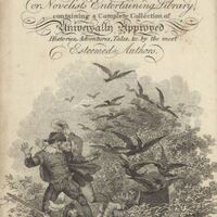 Vignette on title page. As Don Quixote approaches the chasm of Montesinos’ cave, a flock of crows and rooks surprises him, knocking him to the ground. Sancho Panza and the bachelor’s cousin are also pictured. Signed by R. Corbould (illustrator) and W. Hawkins (engraver), dated 1796. Part 2, ch. 22.