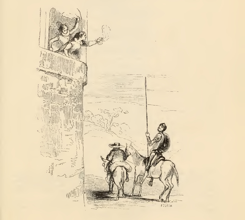 Having grown sedentary within the duchess' castle, Don Quixote (right), clad in full armor, departs for adventure upon his horse. In his left hand Quixote holds a spear while in his right hand he holds a shield, and stopping for a moment he looks up and towards the left. To Quixote's left, Sancho Panza can be seen upon his donkey riding straight ahead. In the top left in a tower of stone women wave handkerchiefs in bidding farewell to the knight and his squire.