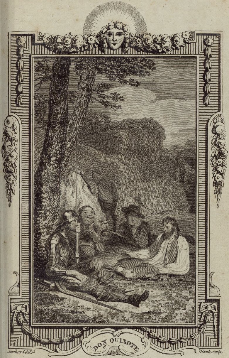 Cardenio recounts his story to Don Quixote, Sancho Panza, and the goatherd. He asks them not to interrupt him because he would like to pass quickly through the tale of his misfortunes. Signed by T. Stothard (illustrator) and J. Heath (engraver). Plate XIV. Part 1, ch. 24.