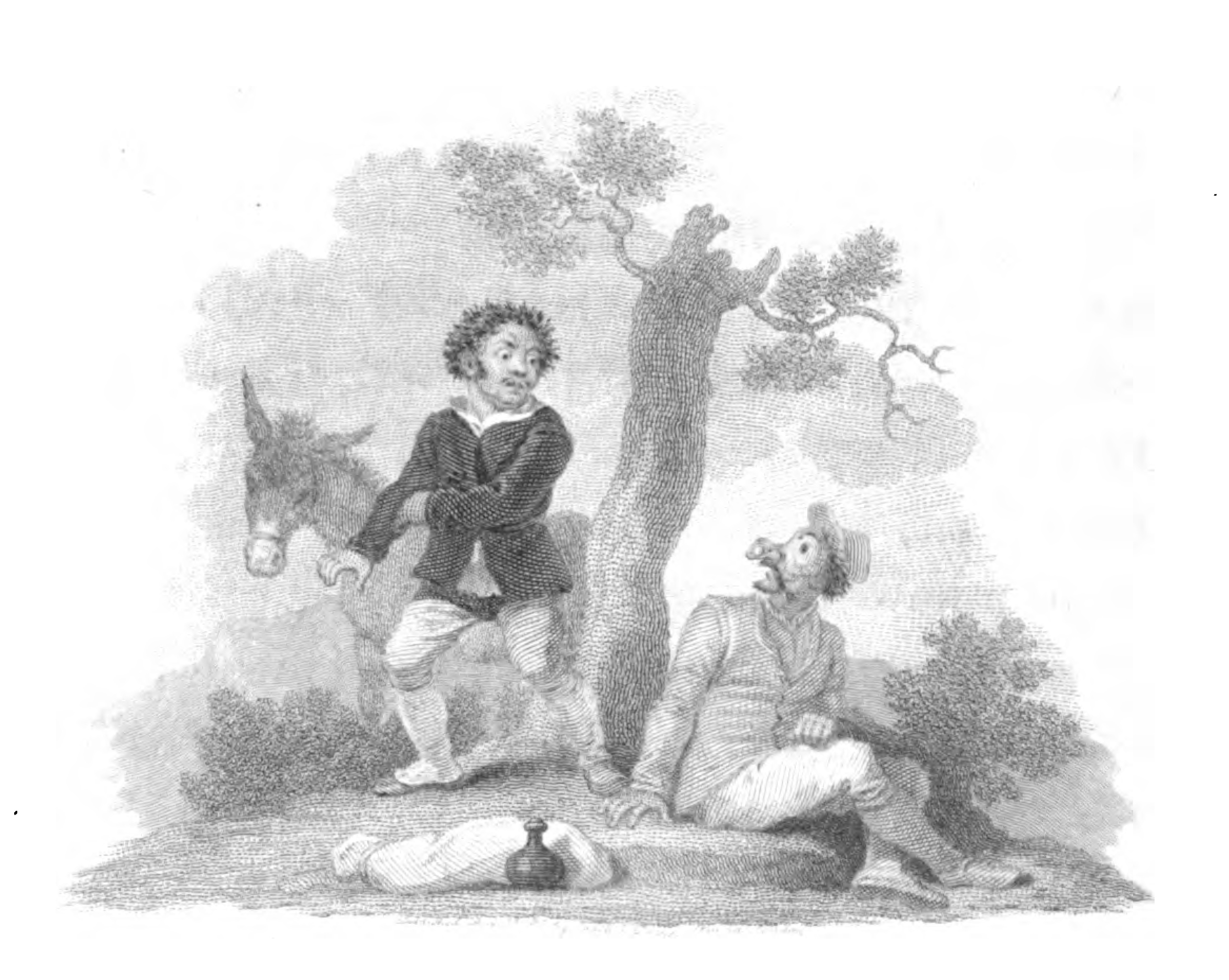 At dawn, Don Quixote and the Knight of the Woods prepare to duel. Their squires both sit beneath a tree to see who of their master's is superior. But the moment Sancho Panza lays his eyes upon the squire of the wood's nose, Sancho recoils in terror. The Squire of the Wood's nose was now so large, that it almost overshadowed his wholeface. The hawk nose is full of warts and carbuncles, of the color of a mulberry, and hanging two fingers breadth below his mouth . Sancho, at the sigh of the nose, began to tremble from head to toe. Unbeknownst to Sancho, the nose is a fake designed to off-put Sancho and Quixote. In the foreground, a sack and bottle lie on the ground, likely to serve as provisions for the two squires in watching the duel. Behind Sancho his Donkey, Dapple, turns its head to see what its owner has become frightened of.