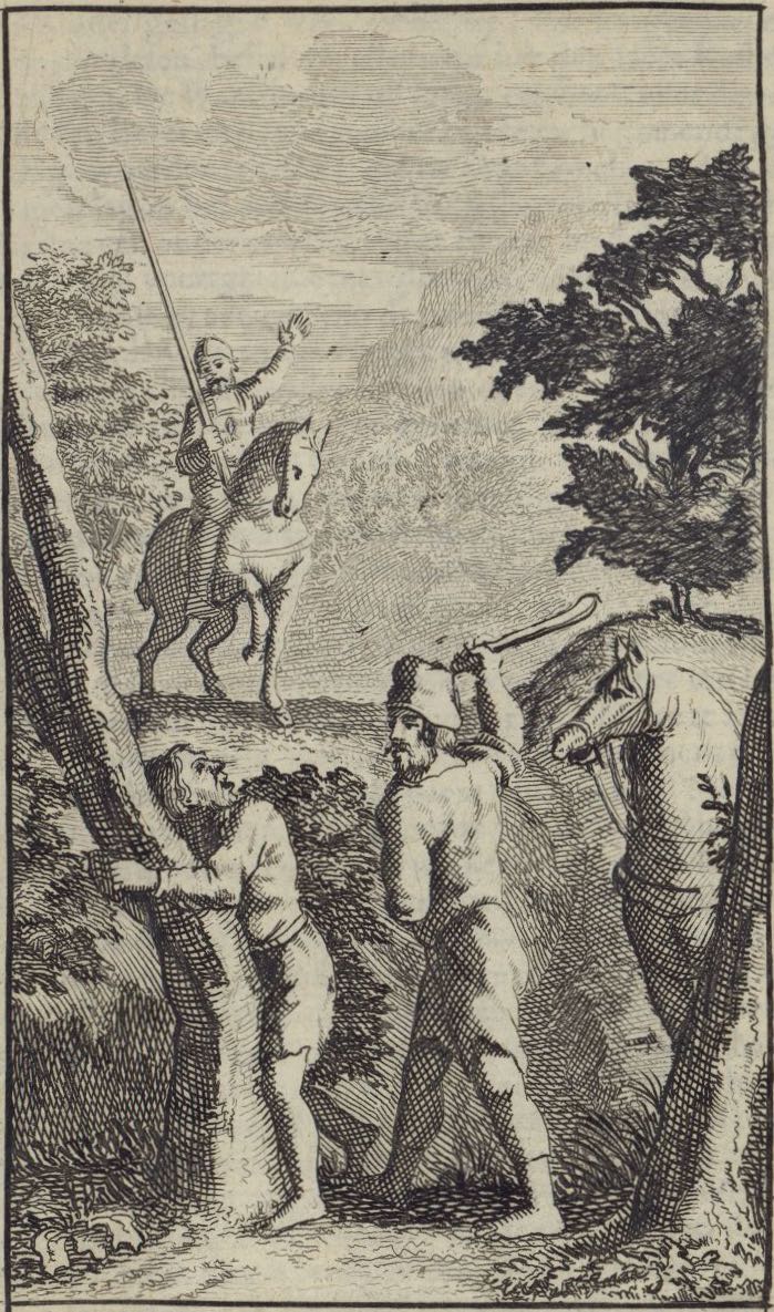 In the foreground, Juan Haldudo reprimands and whips Andrés, who is tied to an oak, with a leather strap. Juan’s mare is tied to another. In the background, Don Quixote hears Andrés’ cries and directs Rocinante in their direction. Unsigned. Part 1, ch. 4.