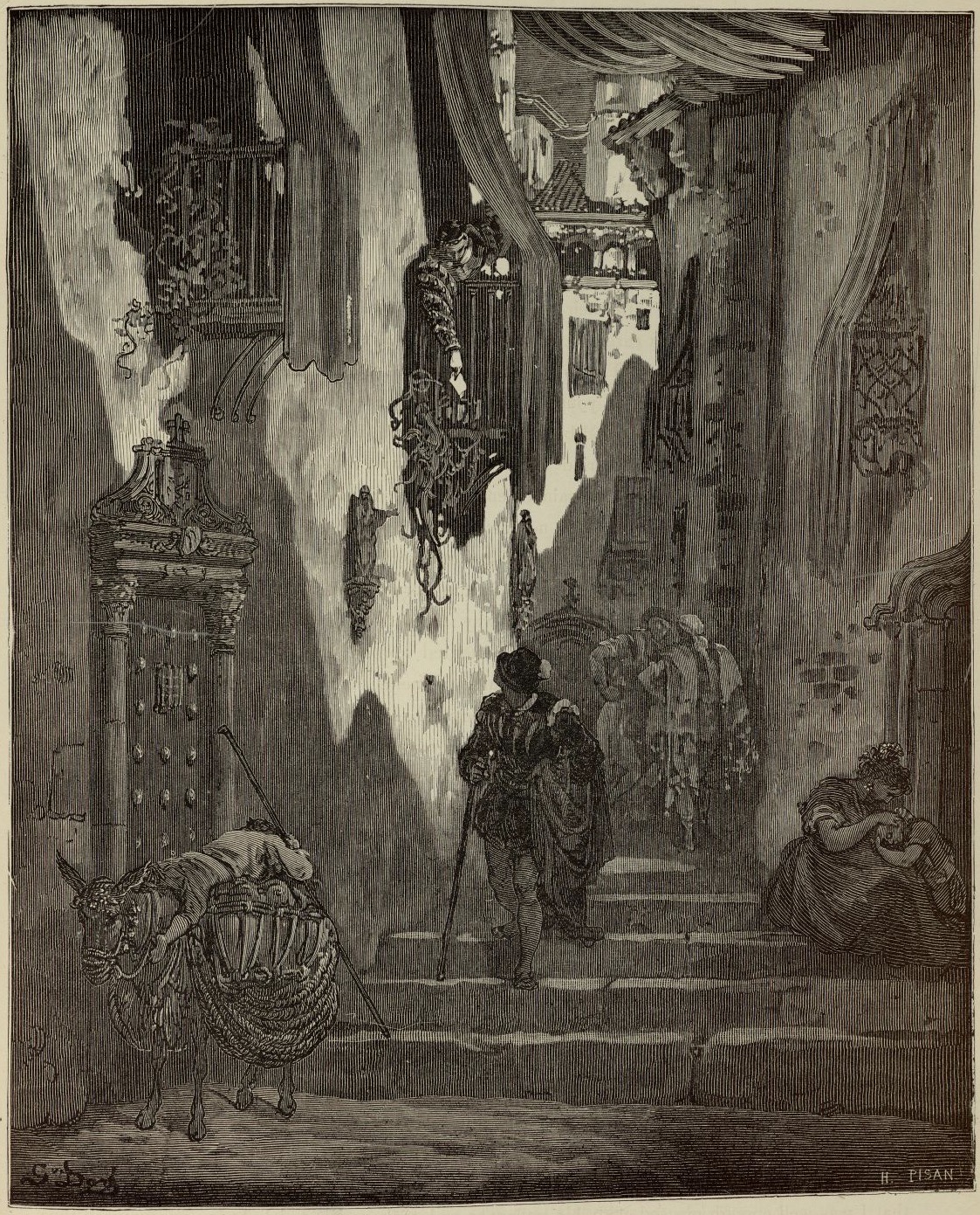 The illustration represents part of Luscinda’s story as told by Cardenio to the priest and the barber: Luscinda asks a man to take a letter to Cardenio, throwing down a knotted handkerchief containing a hundred reales, a gold ring, and the letter. Signed by G. Doré (illustrator) and H.-J. Pisan (engraver). Part 1, ch. 27.