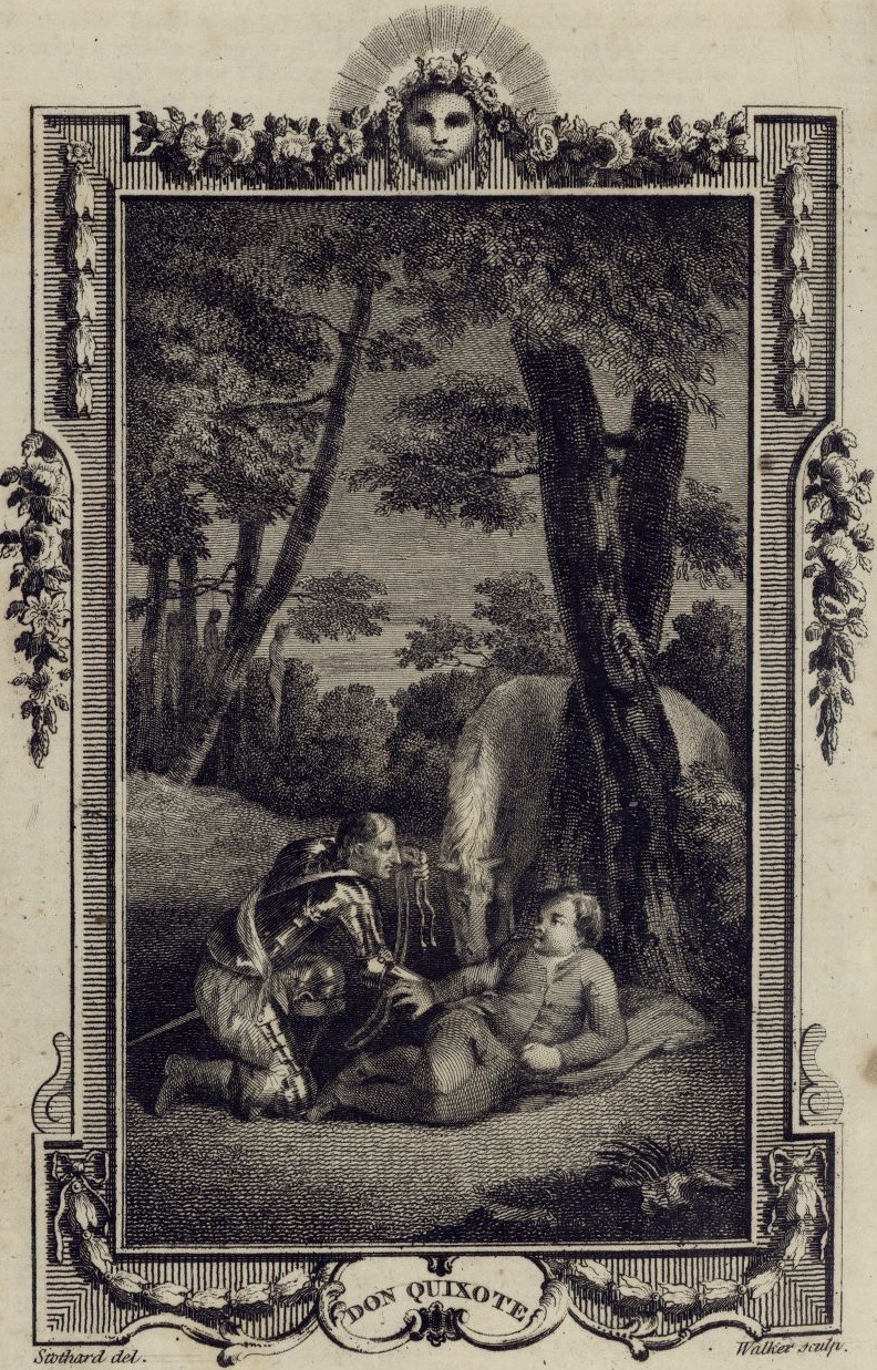 Don Quixote tries to give Sancho Panza two thousand lashes to discharge the debt that he had assumed. They struggle and Sancho gains the upper hand. He makes Don Quixote promise not to whip him. In the background, the bodies of outlaws and bandits hang from tree branches. Signed by T. Stothard (illustrator) and Walker (engraver). Plate XVI. Part 2, ch. 60.