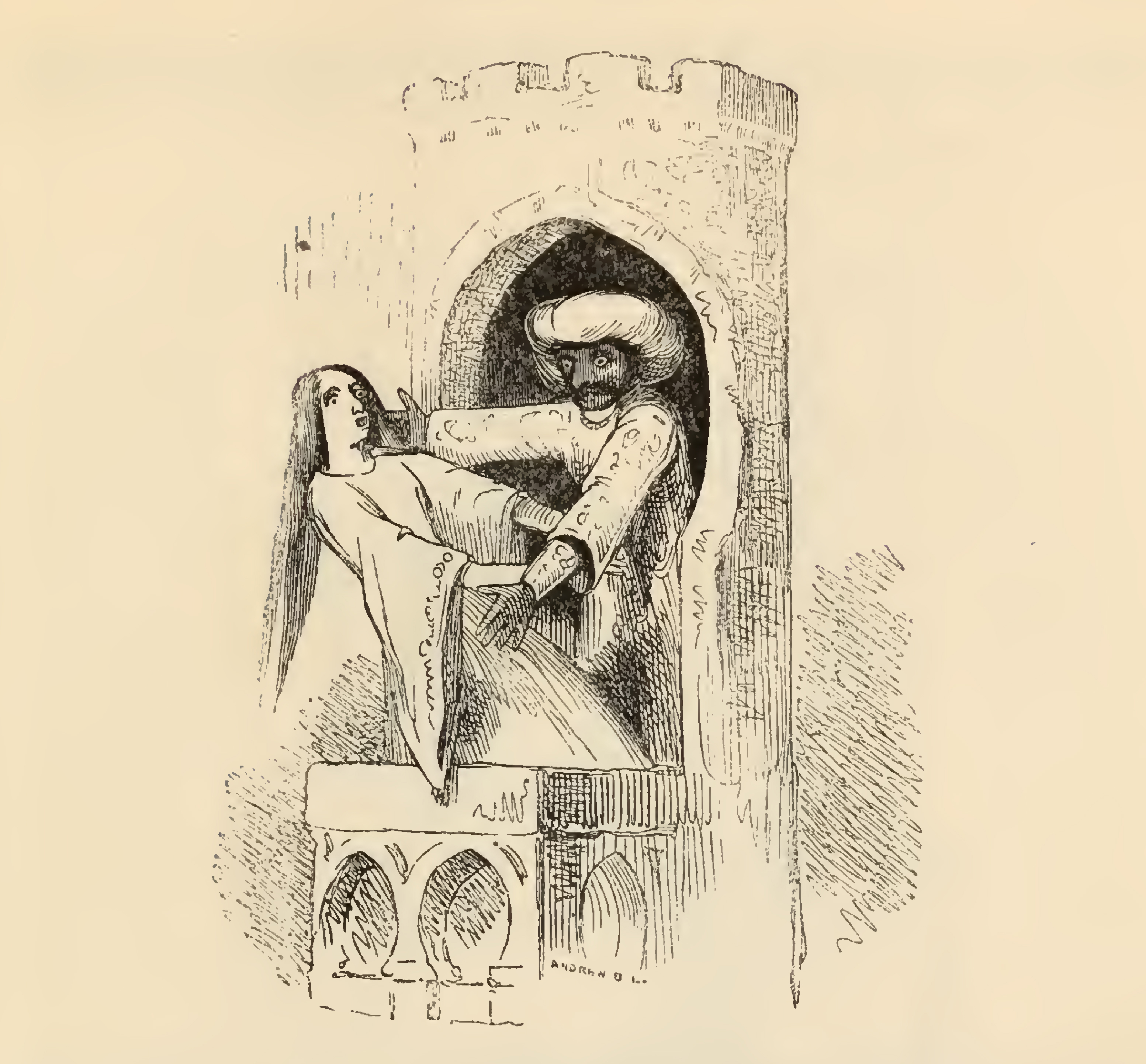 In master Peter's puppet show, one of the towers of the Alcazar of Saragossa called Aljaferia is pictured with a long haired woman in North African apparel standing on the balcony in a Moorish habit, this is Melisandra. Now an Algerian man dressed in a turban and white clothes comes behind Melisandra and grabs her to force a kiss full on her lips, his puppet arms extended outwards, while Melisandra, appearing human-like, tries to push him away.