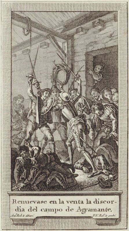 During the dispute about the packsaddle and the barber’s basin, Don Quixote accuses an officer of the Holy Brotherhood of lying and swings at him with his lance. This incites a fight between the officers of the Holy Brotherhood and the innkeeper on one side, and Don Quixote, Don Fernando, Cardenio, and Don Luis’ servants on the other. In the midst of the chaos and confusion, Don Quixote thinks that he has been plunged headlong into the discord at Agramante’s camp, a proverbial dispute described by Ariosto in Orlando furioso. Signed by A. Rodríguez (illustrator) and P. Rodríguez (engraver). Part 1, ch. 45.