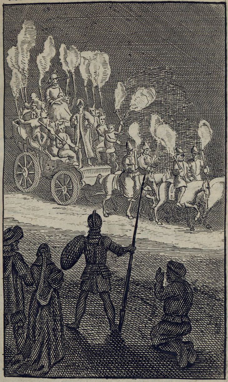 - In the background, Merlin’s cart enters, carrying Dulcinea. The scene is lit by torches carried by the company. In the foreground, silhouetted by this light, are the duke, the duchess, Don Quixote, and Sancho Panza. Unsigned. Part 2, ch. 35.
