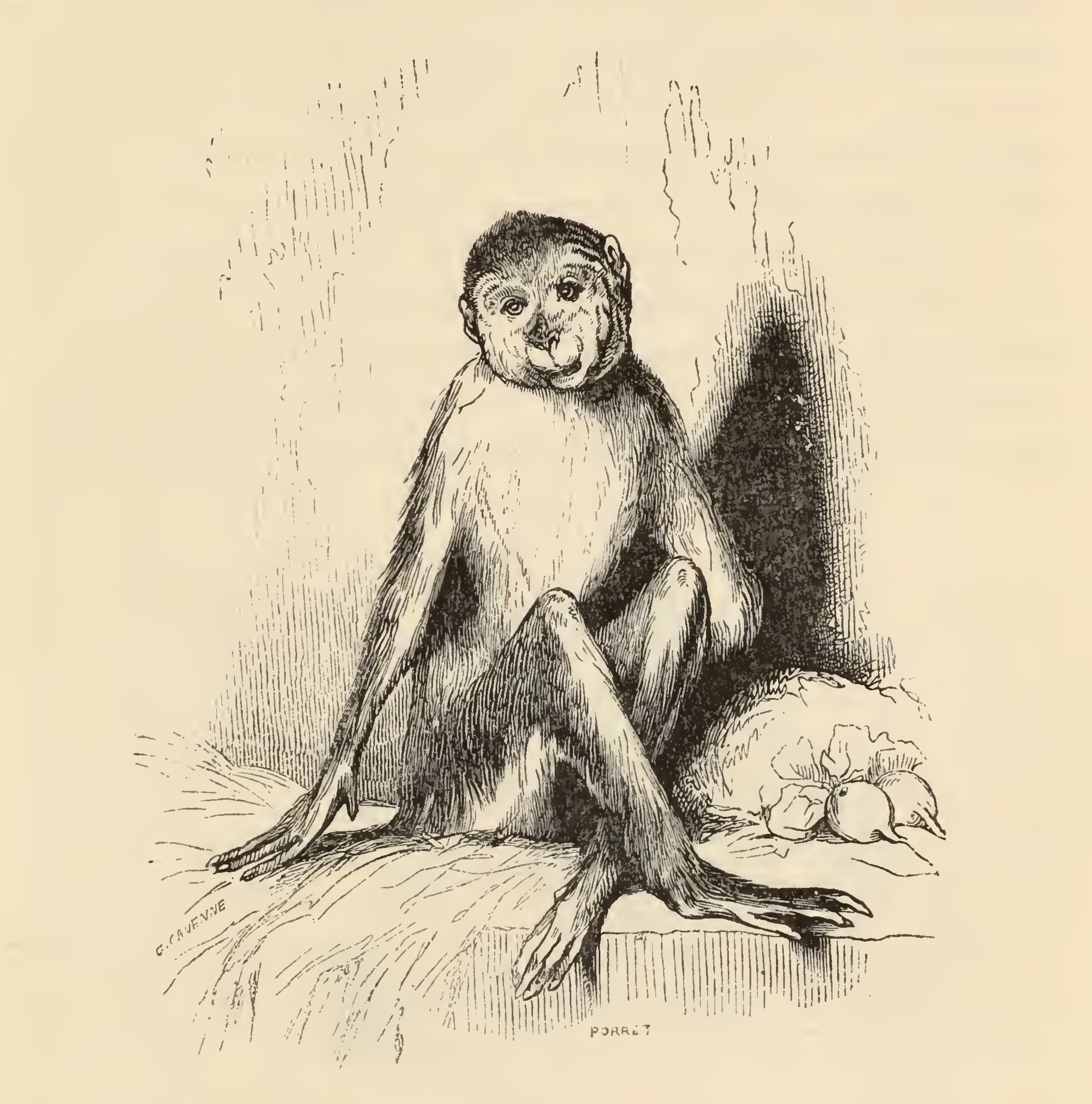 - A monkey sits cross-legged on a counter in an inn, two turnips and a bag of grain lie on the right.