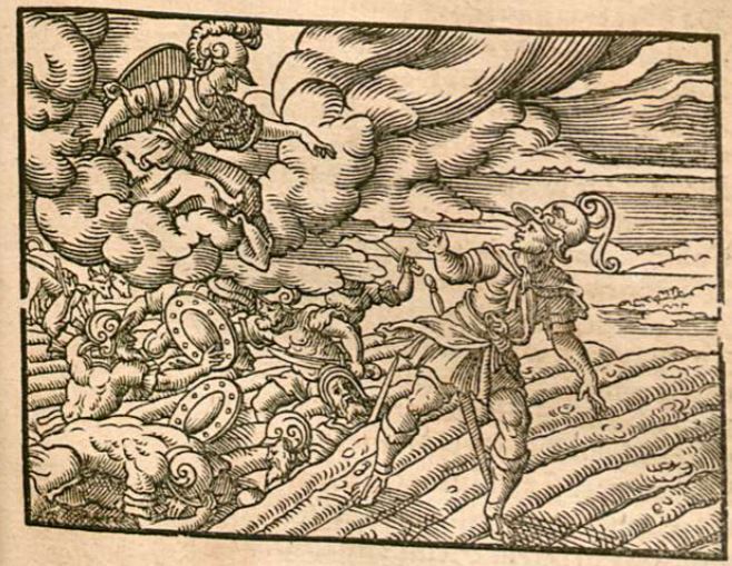 This engraving depicts Cadmus speaking with the goddess Pallas, also known as Minerva. Pallas is depicted flying above Cadmus in the clouds as she tells him to sow the teeth of the serpent that he had just slayed into the ground which will generate people. Cadmus obeys the goddess and proceeds to sow the teeth of the serpent. Subsequently, the sown teeth begin to produce fully armed soldiers as a result, which is illustrated happening behind Cadmus. These cultivated humans now become the newly formed population of Thebes.