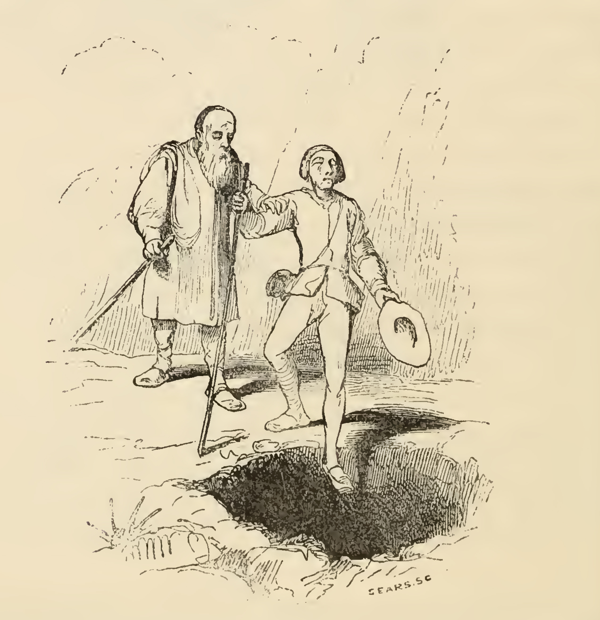 A bald blind old man (left) with a long thick beard that falls past his shoulders reaches out to his blind companion (right) with his left hand to grab him by the shoulder so that he will not fall into the gaping hole before them. Both men carry a walking stick in their right hands, and the man on the right holds a hat in his left hand. For clothing the old man has a loose robe whilst the young man wears well-fitted apparel and pants that do not differentiate with the leg. The image is occasioned by the Squire of the Woods saying "if the blind lead the blind, both are in danger of falling into the pit" in referring to the relationship between Quixote and Sancho.