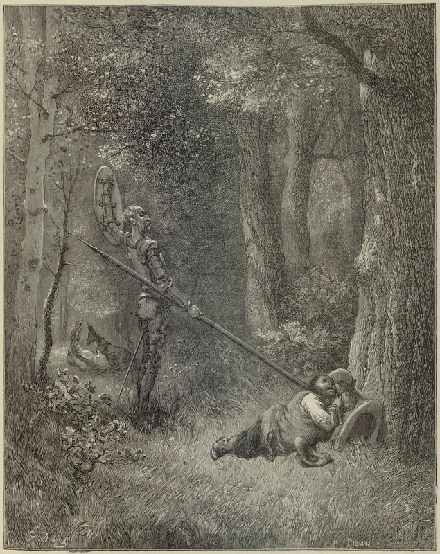 - Don Quixote wakes Sancho Panza with the blunt end of his lance. Signed by G. Doré (illustrator) and H.-J. Pisan (engraver). Part 2, ch. 20.