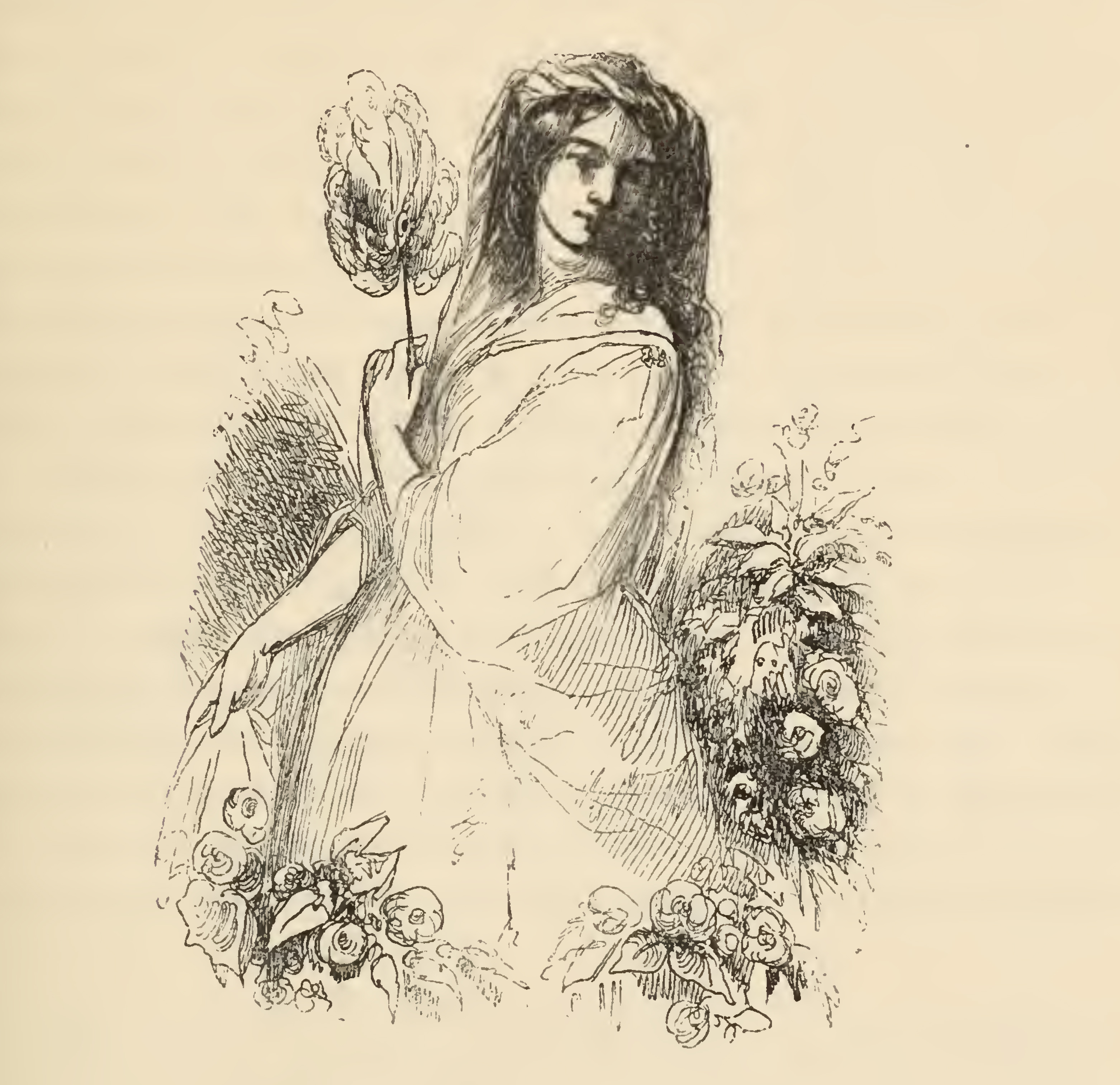 A young woman in a braided headdress and white dress lifts her skirt to avoid getting caught in the thorns. In her left hand she holds a fan of peacock feathers close to her face. She is surrounded by many flowers, though roses are most numerous amongst them. The Knight of the Mirrors tell Quixote that this woman is Casildea de Vandalia who has employed him as Hercules was by his step-mother, and that he had needed to succeed in many perils, and was promised, at the end of each of them, that the next should crown his hopes of loving her.