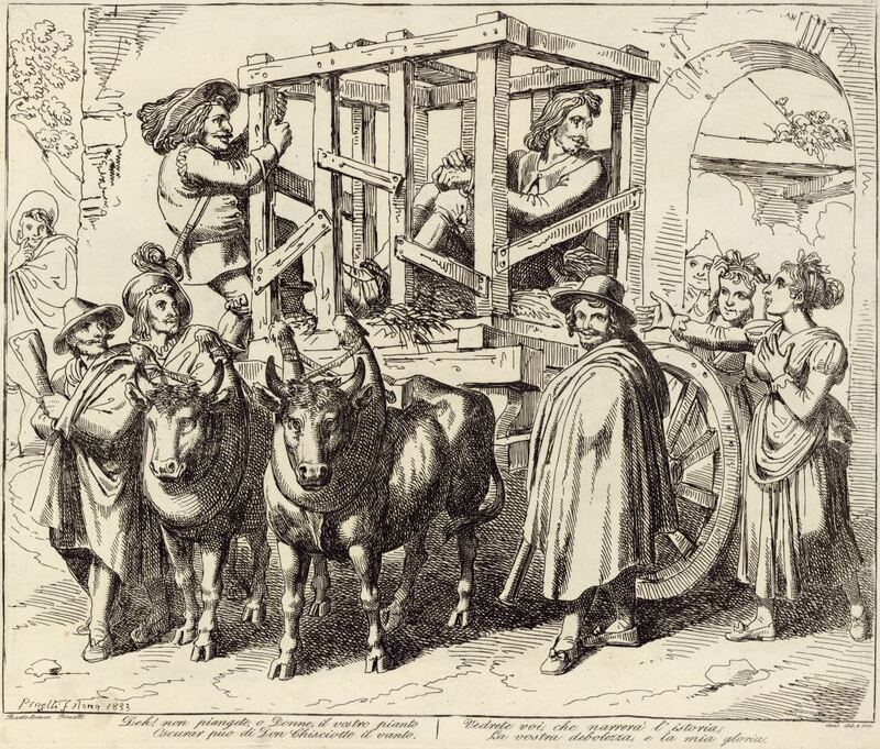 Don Quixote is enchanted and trapped in a cage on a cart. The innkeeper’s wife, her daughter, and Maritornes take their leave of Don Quixote, pretending to weep with sorrow at his misfortune. Sancho Panza, the officers of justice, and others are also pictured. Signed by Bartolomeo Pinelli (engraver and illustrator) and dated Rome, 1833. Plate 35. Part 1, ch. 47.