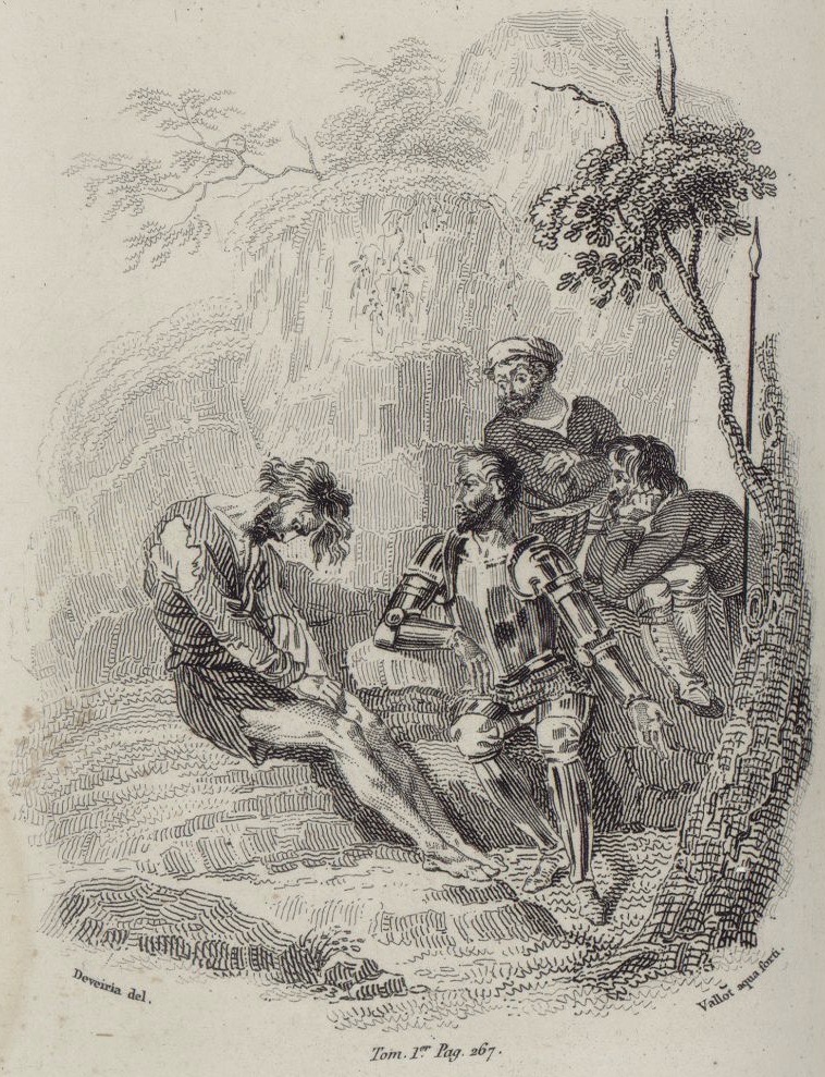 Cardenio recounts his story to Don Quixote, Sancho Panza, and the goatherd. He asks them not to interrupt him because he would like to pass quickly through the tale of his misfortunes. Signed by A J.-J.-M. Devéria (illustrator) and P. J. A. Vallot (engraver). Part 1, ch. 24.