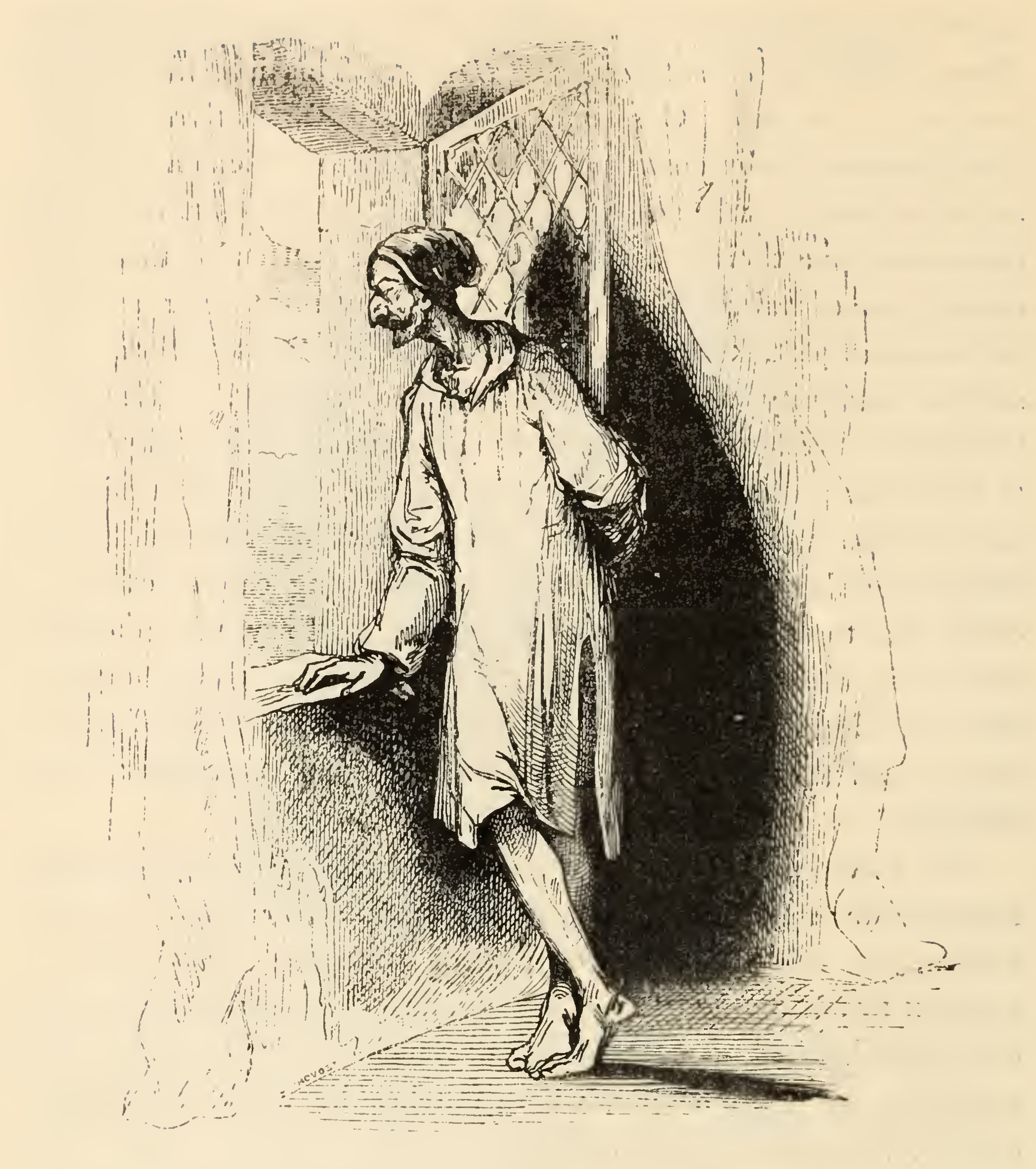Having gotten up from his bed, Don Quixote, dressed in a loose long sleeved shirt that fell down to his knees and a greasy cap, opened the casement of a grated-window, and looked out into the night. Quixote leans against the window sill with his right hand, his left hand behind his back.