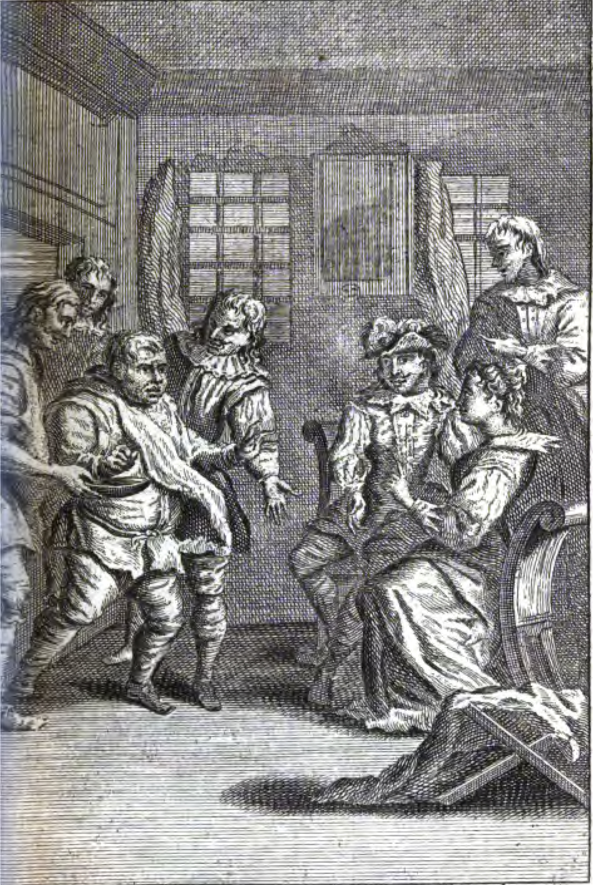 Don Quixote (far right) speaks with the Duke (facing the reader) and Duchess (seated and facing the doorway) about the squire Sancho Panza. As Quixote praises Sancho Panza for his good intentions and ability to govern Sancho comes dashing into the room, looking around disheveled with a cloth bib around his neck. Behind Sancho follow kitchen boys and other servants, one of whom came with a basin of dirty dishwater. The fellow with the dishwater tries to apply it to Sancho's beard. The Duchess asks what the trouble is, and the servants respond that Sancho refuses to have his beard washed. Sancho is incensed by this accusation, as he is every bit willing to have his beard washed, but also knows that he is being made the butt of the joke by being washed with dirty water.