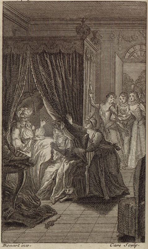 Don Quixote, his face bandaged and marked by the cat’s claws, lies sleepless in bed. Doña Rodríguez, duenna to the duchess, visits him in his room. She wears long and intricate white veils. Altisidora and the duchess’ other maidens watch from the door, holding their shoes. Signed by Bonard (illustrator), no given name, and L. Cars (engraver). Part 2, ch. 48.