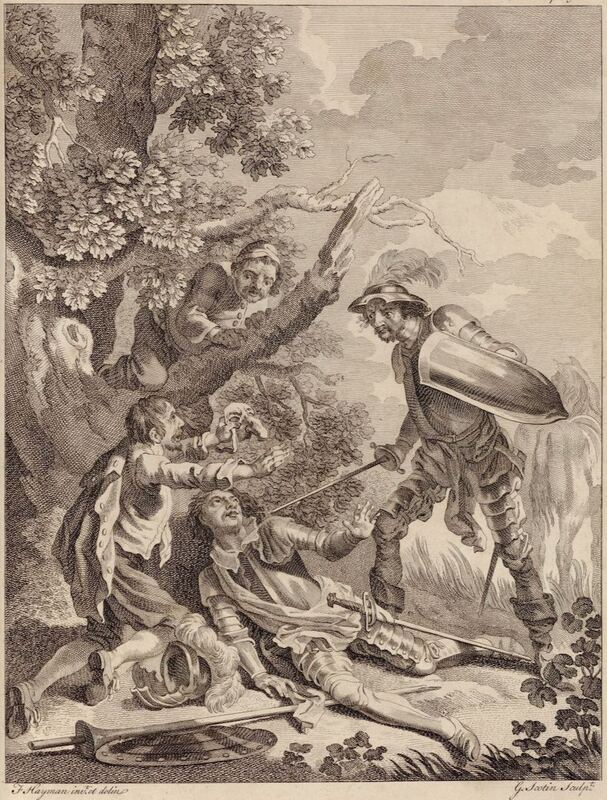 In the aftermath of their battle, Don Quixote, with a gesture of clemency, orders the Knight of the Mirrors (Sansón Carrasco) to present himself to Dulcinea in El Toboso on his behalf. Sansón’s squire, Tomé Cecial (left) takes off his fake big nose, revealing himself to Don Quixote and Sancho Panza. Sancho Panza has climbed into a tree, and observes the scene from above. Signed by F. Hayman (illustrator) and L. G. Scotin (engraver). Part 2, ch. 14.