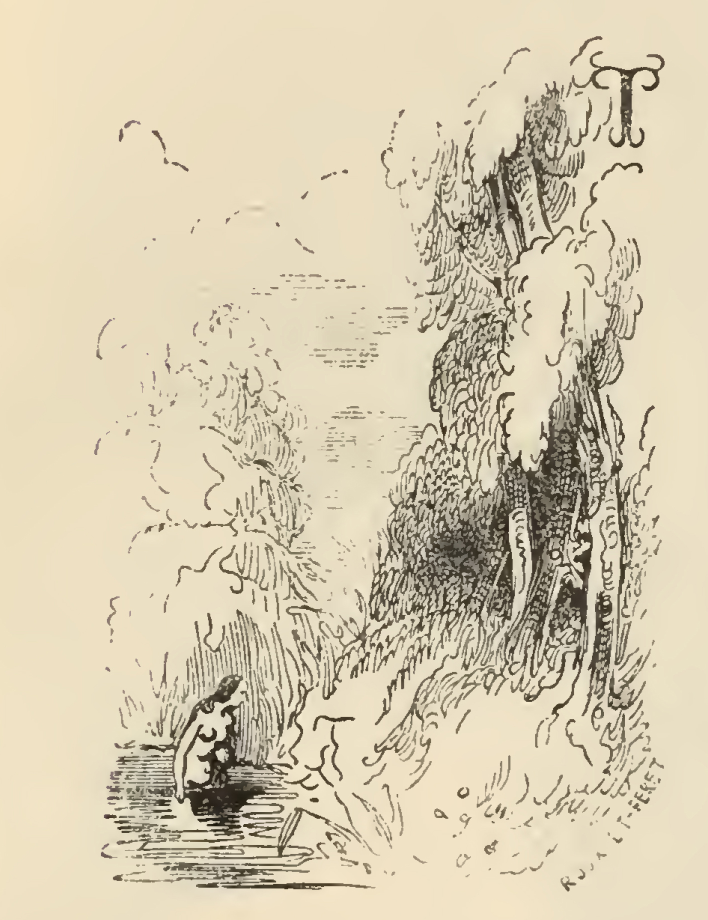 A naked nymph with long black hair stands in the midst of a river with a forest on the right. The image is occasioned by Don Quixote saying " not the greatest beauty upon earth shall prevail on me to cease adoring her, who is engraven and imprinted in the bottom of my heart and in the inmost recesses of my entrails. Whether, my dearest lady, you be now transformed into a garlic-eating country-wench, or into a nymph of the golden Tagus, weaving tissue-webs with gold and silken twist".