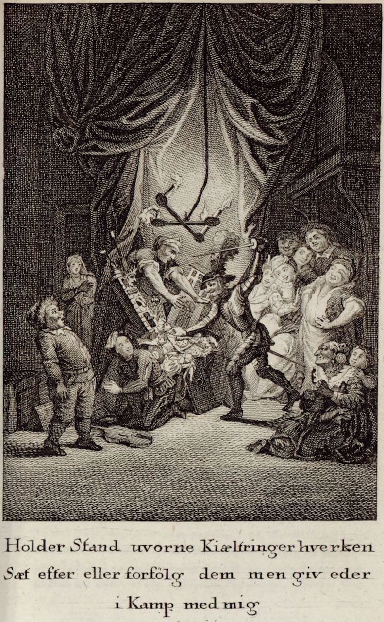 Don Quixote attacks Maese Pedro’s theatre and puppets, while the innkeeper and other astonished theatregoers watch. In the background, a chandelier swings dramatically from the ceiling and a large curtain serves as a backdrop. Unsigned. Part 2, ch. 26.