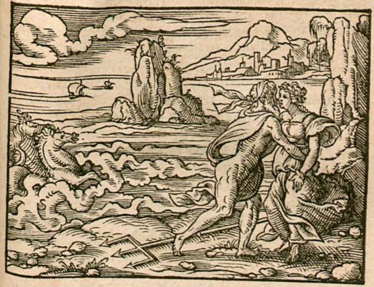 The woman depicted in this engraving is Caenis, a young virgin from Thessaly who had been the prize of many suitors. She was walking along the beach when the sea-god Neptune noticed her beauty and took Caenis by force. Neptune’s trident is illustrated by his feet and his seahorse drawn chariot is visible on the left side of the engraving in the water. After raping Caenis, Neptune grants her one wish. She asked to never be harmed or suffer any pain like that again, so Neptune transformed her into a man named Caeneus who would be protected from all wounds.