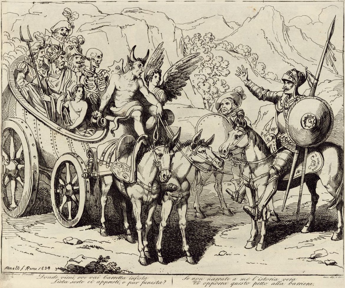 Don Quixote and Sancho Panza encounter a cart carrying the actors of Angulo el Malo’s company for the mystery play ‘The Assembly of Death.’ The latter are dressed as Devil, Cupid, Death, Angel, Emperor, Queen, and Soldier. The knight orders them to stop and tell him who they are. Signed by Bartolomeo Pinelli (engraver and illustrator) and dated Rome, 1833. Plate 42. Part 2, ch. 11.