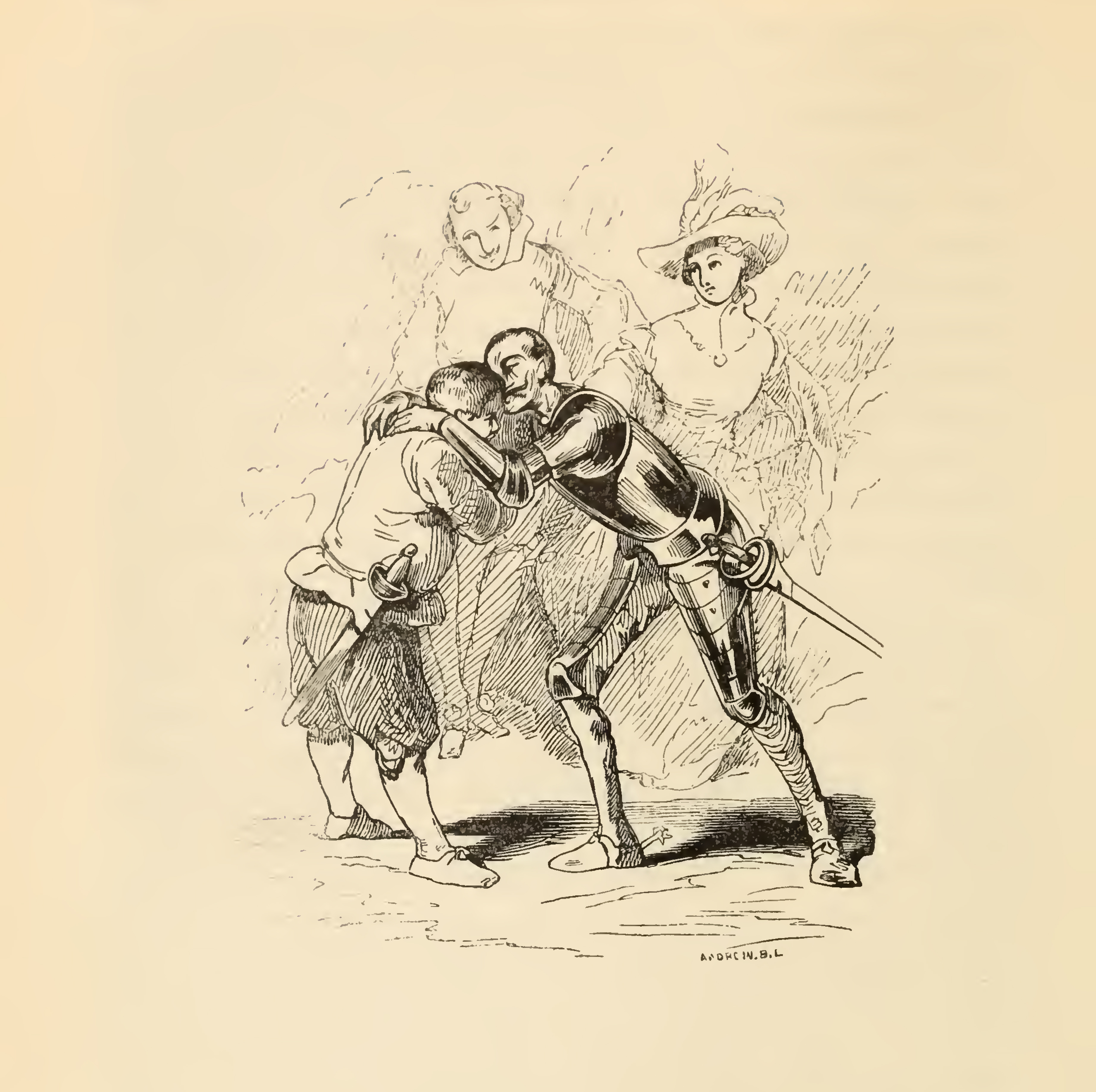 Having accepted penance of a thousand lashes to disenchant Dulcinea, Sancho Panza (left), with sword equipped by his waist, leans forward. His master DonQuixote (right), clad in armor, leans forward and clings his hands to his squire's neck, kissing his squire on the forehead and cheeks. In the background, the duke and duchess look upon the grateful act very pleased with the happy outcome.
