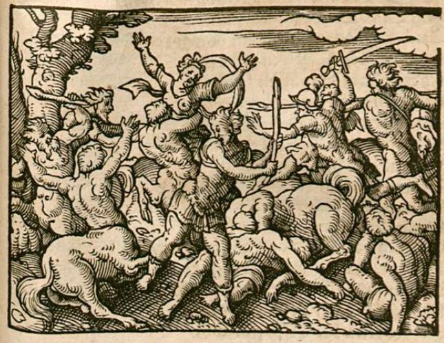 This engraving depicts a chaotic battle between centaurs and the Lapiths. The battle broke out due to one of the centaurs, Eurytus, stealing the bride of Pirithous, the king of the Lapiths. The centaurs were invited to the wedding ceremony, but Eurytus betrayed Pirithous by being overtaken by Hippodame’s beauty and dragging her off. Eurytus is illustrated almost in the center of the engraving with Hippodame in his arms as he carries her away. Her arms are in the air as she pleads for help. Pirithous’ friend, Theseus, is illustrated to the right of Eurytus with a helmet on and his sword behind his head ready to swing at the centaur and save Hippodame.