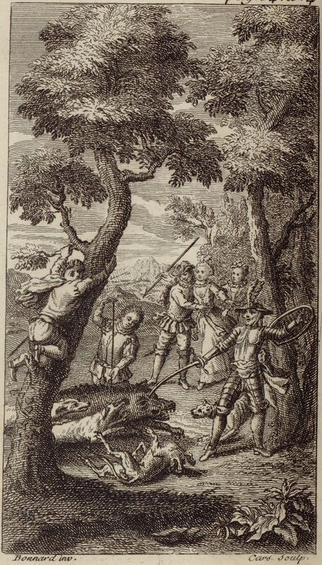 In the foreground, Sancho Panza climbs a tree in fear. In the middle ground, Don Quixote is pictured driving his sword into a wild boar. In the background, the duke embraces the duchess. Also pictured are several hunting dogs. Signed by Bonard (illustrator), no given name, and L. Cars (engraver). Part 2, ch. 34.
