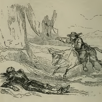 Don Quixote (clad in armor) mistakes windmills for giants and speeds upon the first windmill he could come at, breaking his lance into pieces, and being hurled away to the ground. Sancho Panza ran as fast as his ass could drive to help his master, whom he found lying, and not able to stir.