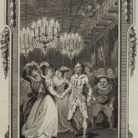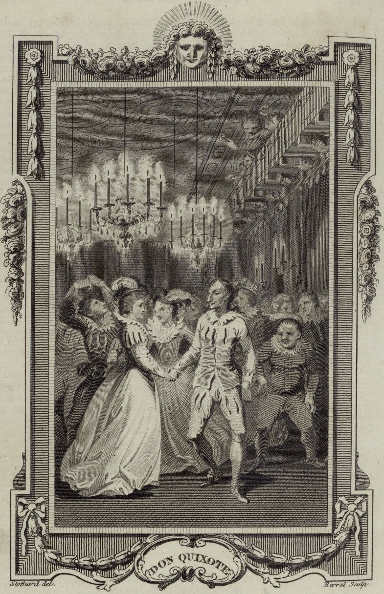- At the soirée, Don Quixote dances with Don Antonio Moreno’s wife and some of her friends. Signed by T. Stothard (illustrator) and O. Birrel (engraver). Plate X. Part 2, ch. 62.