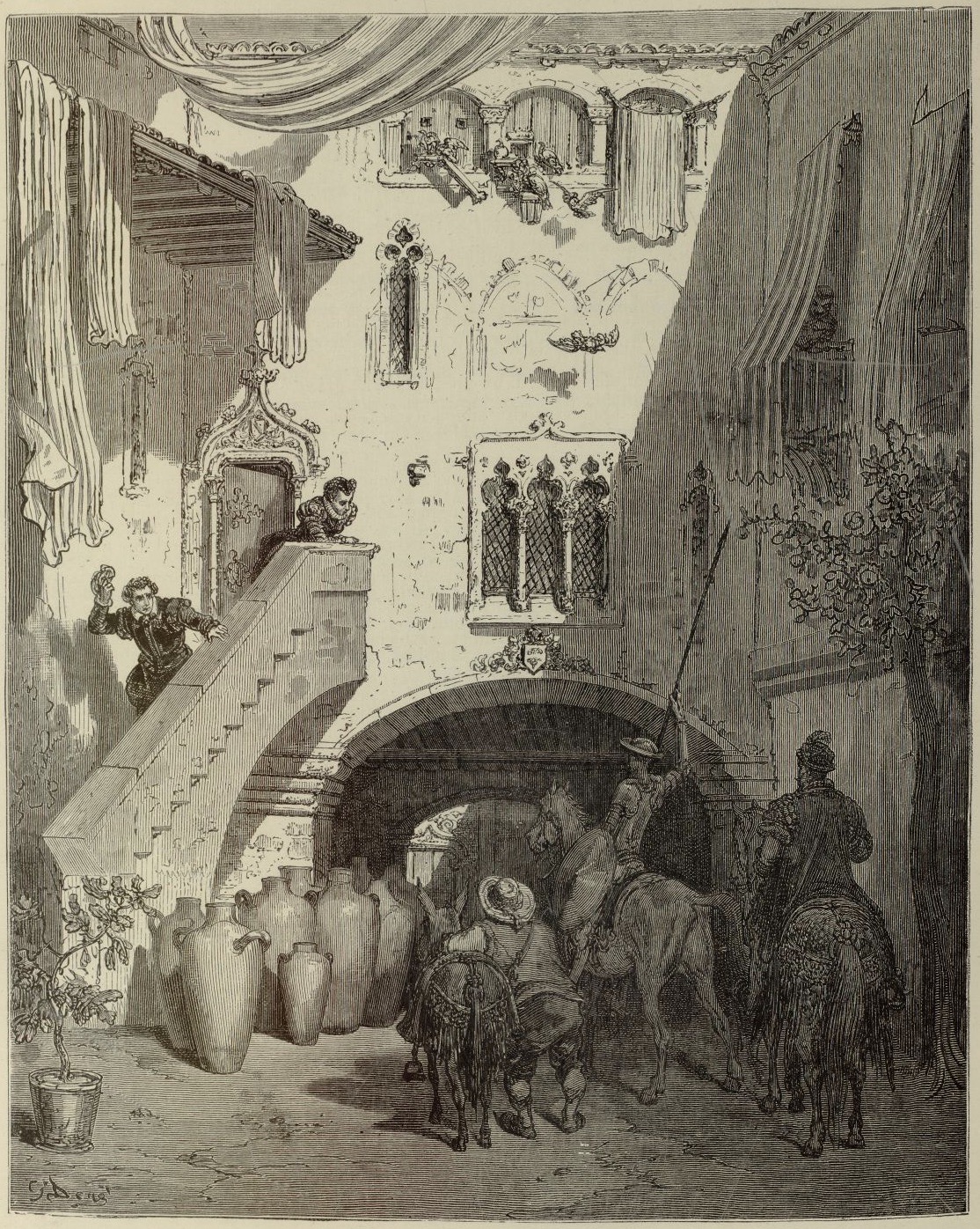 Don Quixote and Sancho Panza arrive at Don Diego de Miranda’s house, where they meet his son, Don Lorenzo, and his wife, Doña Cristina. In the courtyard, Don Quixote finds some tinajas from El Toboso that remind him of Dulcinea. Signed by G. Doré (illustrator) and H.-J. Pisan (engraver). Part 2, ch. 18.