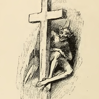 A moustachioed bald man with short horns and angelic wings hides behind a wooden cross, peaking out from behind the shadow, his feet dangling by the base. The image is occasioned by Quixote saying "I have heard say that the devil lurks behind the cross, and all is not gold that glitters".
