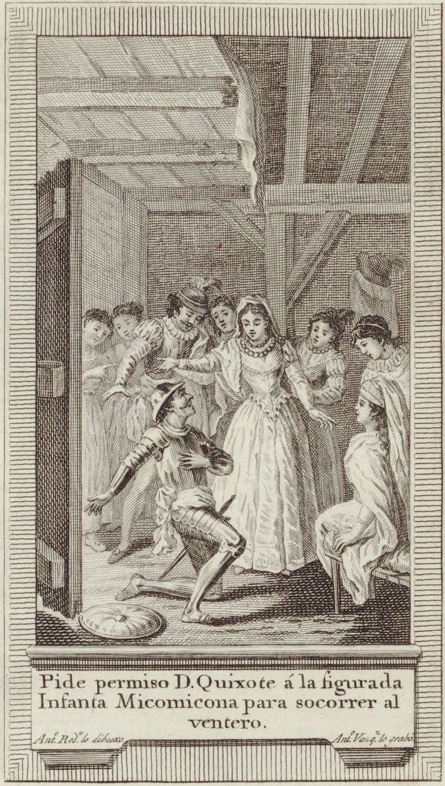 Don Quixote kneels before princess Mimicona (Dorotea) and begs for her permission to help the innkeeper, who is being beaten by two guests who attempted to leave the inn without paying what they owed. The innkeeper’s wife and her daughter beg Don Quixote to help her husband, but at first Don Quixote refuses to do so, replying that he cannot embark on an adventure until he has brought a felicitous conclusion to the one to which he is currently pledged. Also pictured are Don Fernando, Luscinda, Zoraida, Doña Clara, and others. Signed by A. Rodríguez (illustrator) and B. Vázquez (engraver). Part 1, ch. 44.