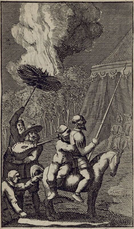 Don Quixote and Sancho Panza are mounted on Clavileño, the famed wooden horse. Two servants simulate its flight with bellows and torches, while another ignites its fuse. The duke and the duchess, seated beneath a grand tent in the background, look on. Unsigned. Part 2, ch. 41.