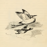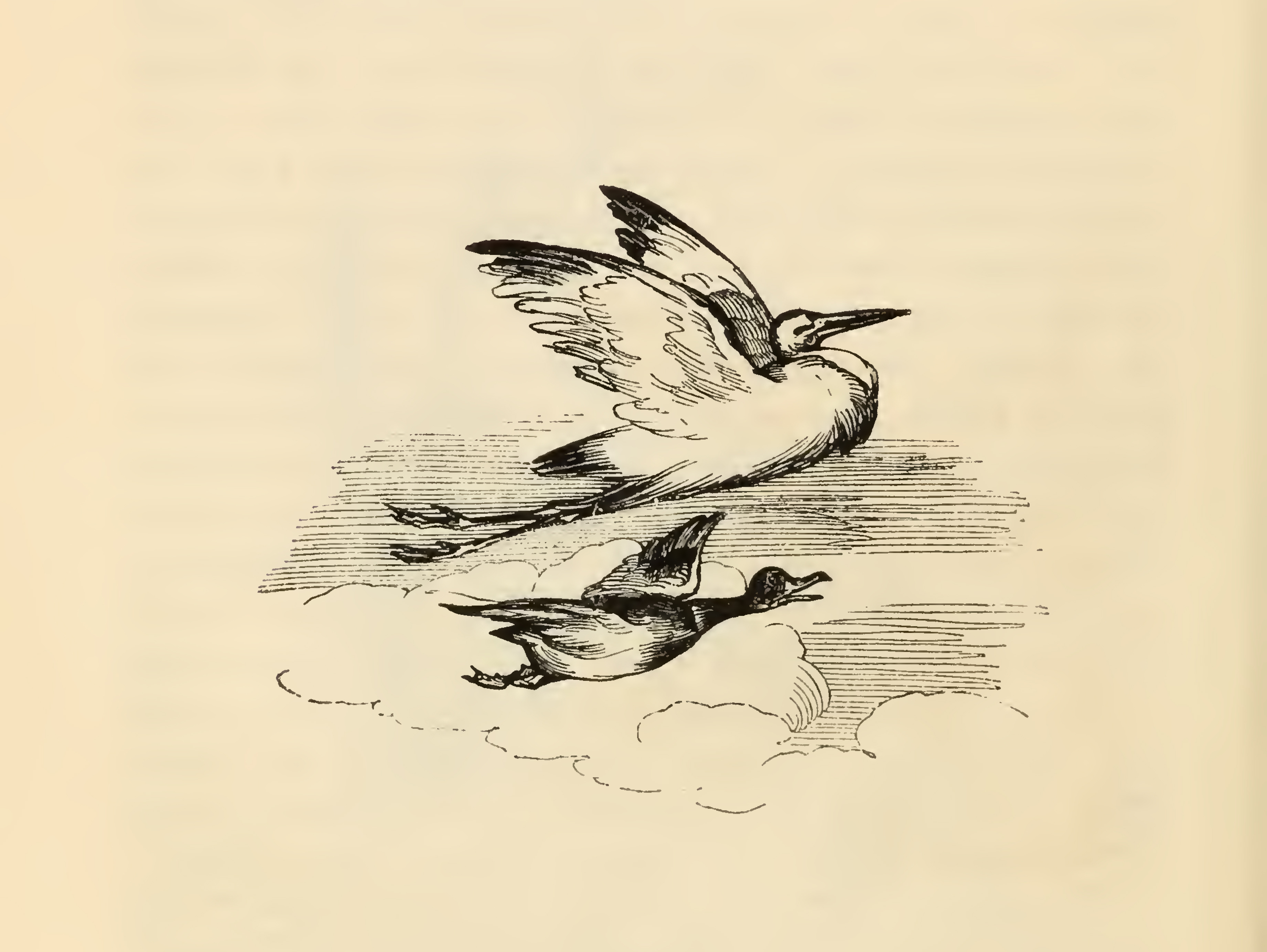 - Two birds fly amongst the clouds. At the top, a heron flaps its wings with its legs trailing behind it. On the bottom, a duck glides pleasantly, its beak agape.