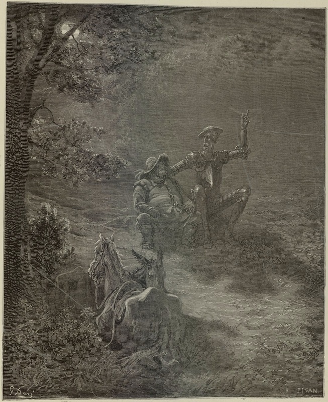 As night falls, Don Quixote and Sancho Panza talk about comedy before their encounter with the Knight of the Mirrors (Sansón Carrasco). Signed by G. Doré (illustrator) and H.-J. Pisan (engraver). Part 2, ch. 12.