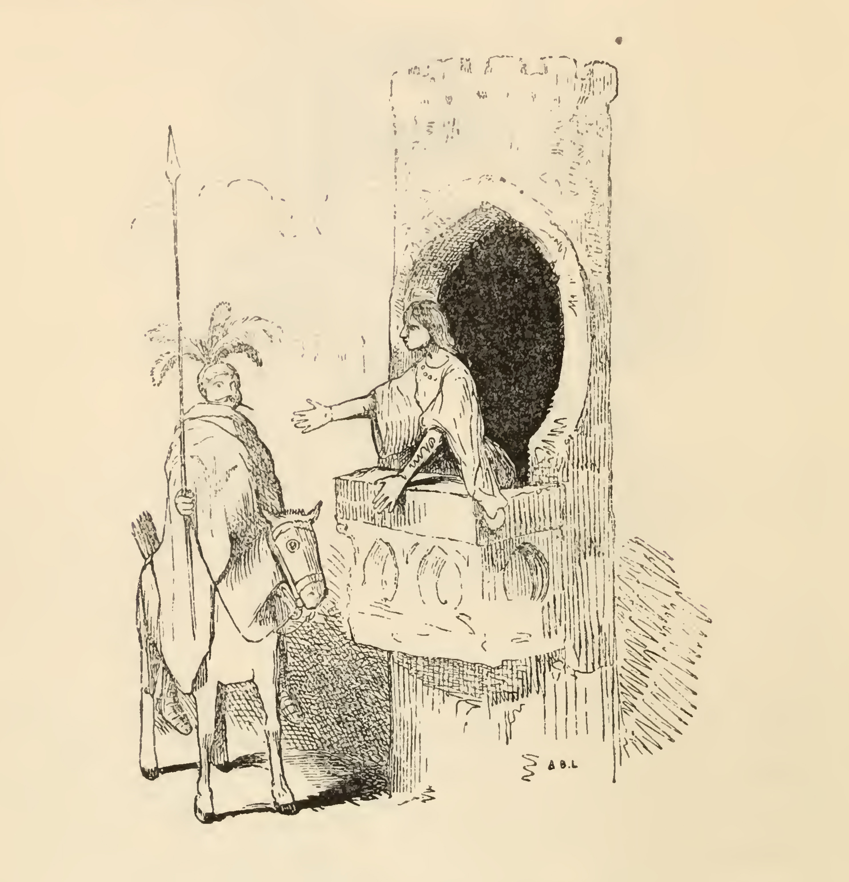 In master Peter's puppet play, a figure approaches from the left on horseback, muffled up in a Gascony cloak with an astoundingly feathery helm and spear by his side. This is Don Gaiferos who rides, to save his spouse, who has been locked in tower by Algerians. From her quarter in the tower she shows herself to her husband with a calm and sedate manner, reaching down towards him. In the illustration the tower appears quite short, really no more than five feet, and it must be assumed that she is not really in front of him, but captive at a much higher elevation, otherwise she could just hop down on her own.
