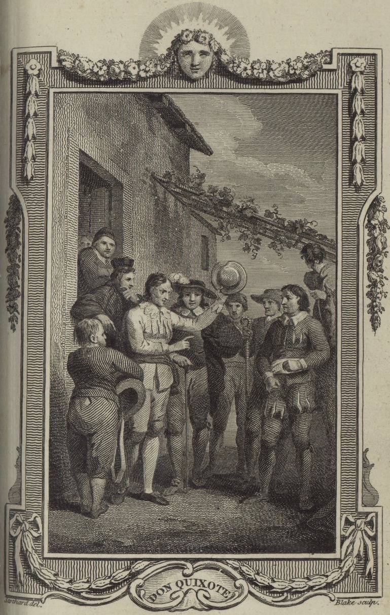 Don Quixote, holding the basin, tries to convince the barber (Maese Nicólas) that the basin is Mambrino’s helmet. Don Fernando, the priest, and Sancho Panza observe them. Signed by T. Stothard (illustrator) and W. Blake (engraver). Plate IX. Part 1, ch. 45.