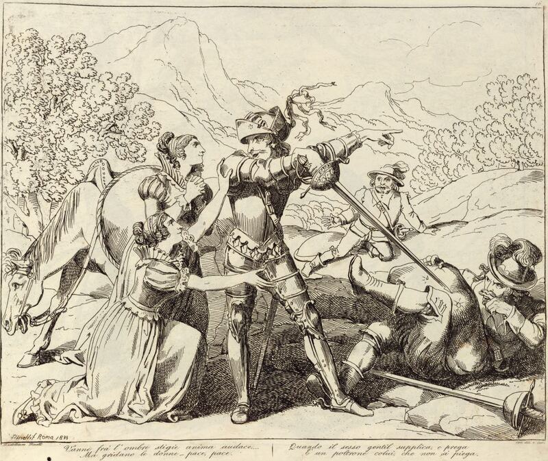 The two frightened Basque ladies beg Don Quixote not to hurt their squire. Don Quixote makes him promise to travel to Toboso and present himself to Dulcinea. Sancho Panza is pictured in the background. Signed by Bartolomeo Pinelli (engraver and illustrator) and dated Rome, 1833. Plate 16. Part 1, ch. 9.