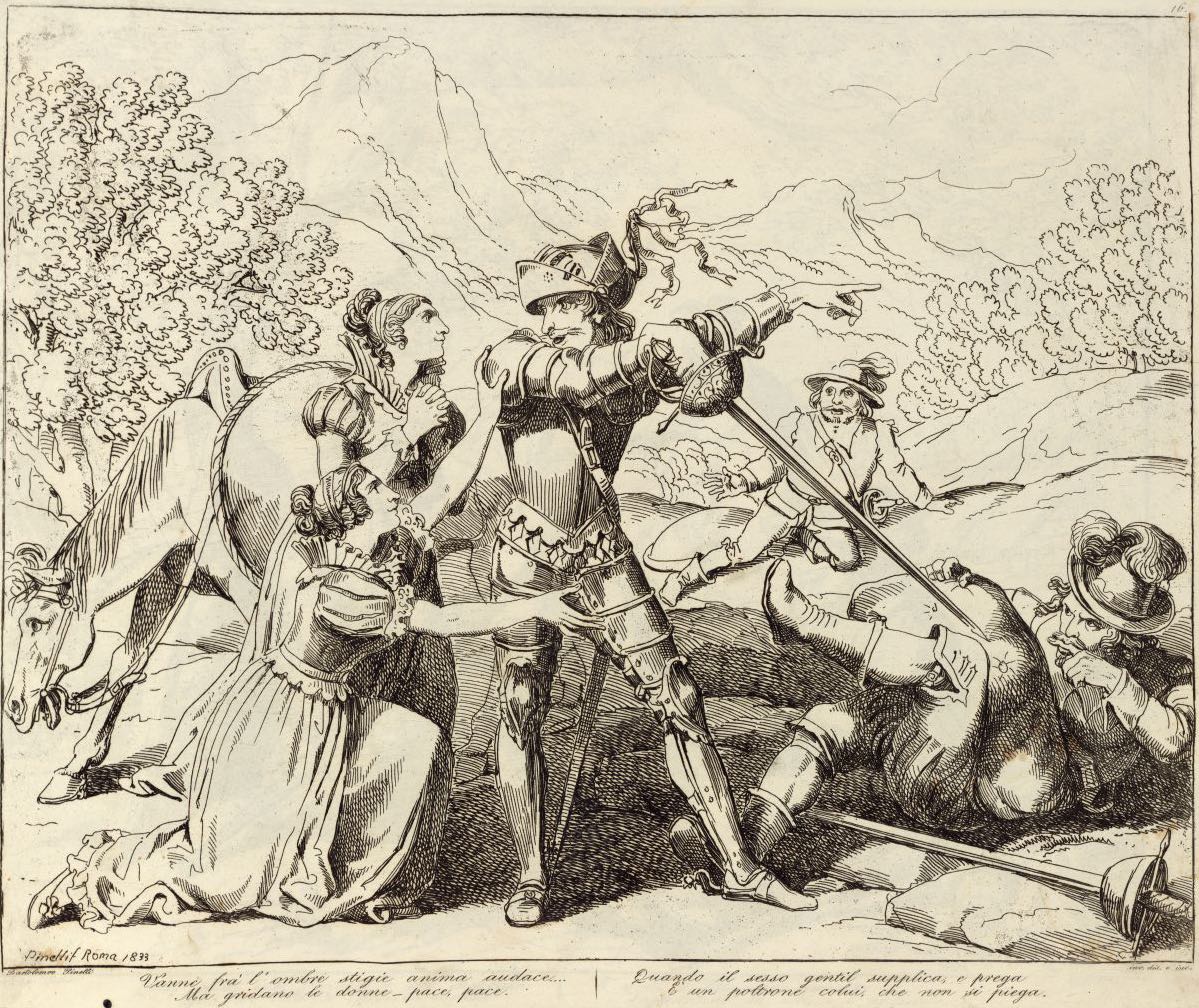 Vanne frà l'ombre stigie anima audace... / Ma gridano le donne _ pace, pace. / Quando il sesso gentil supplica, e prega / È un poltrone colui che non si piega.