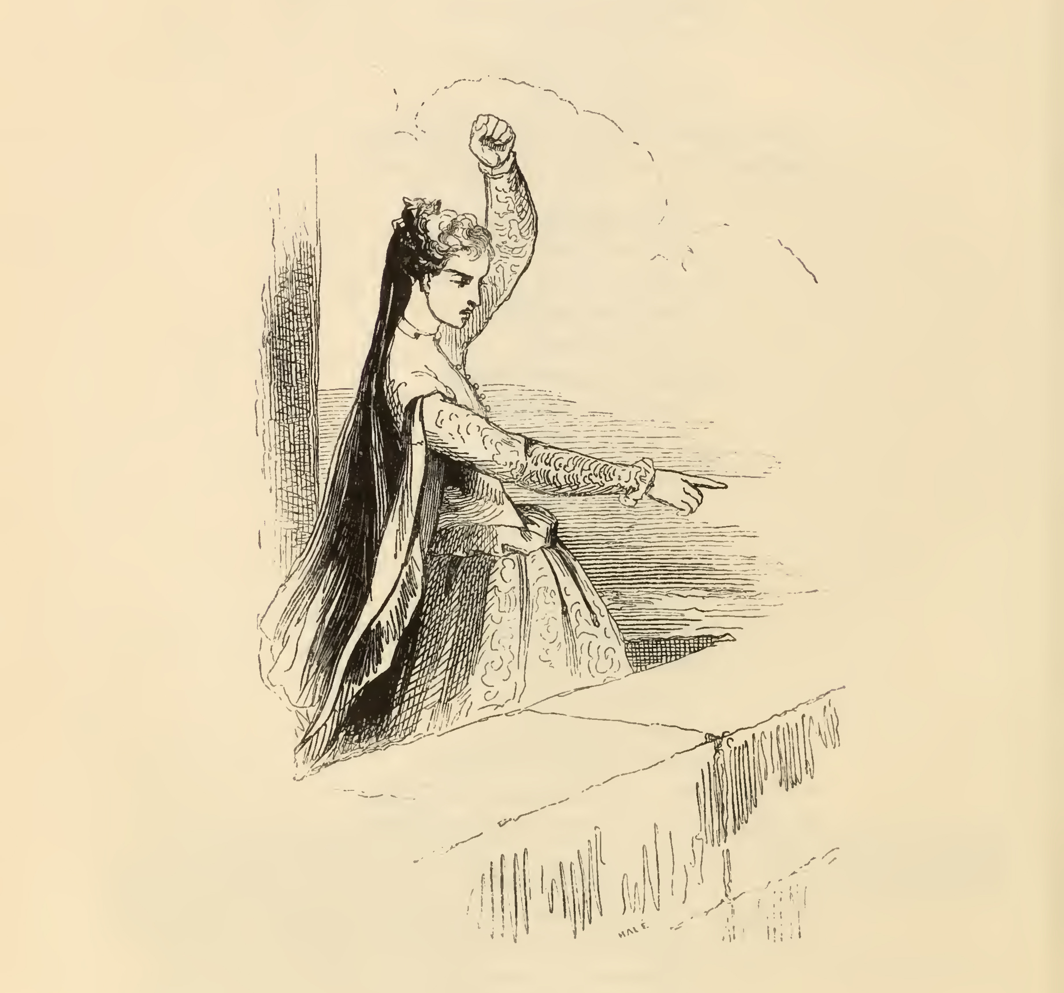 After the departure of Don Quixote from the duchess' castle, a woman perched atop a balcony points her right hand towards the plains below and clenches her left hand above her head into a fist. She wears a courtly dress with long sleeves and frilly cuffs along with a black veil which has been pulled back.