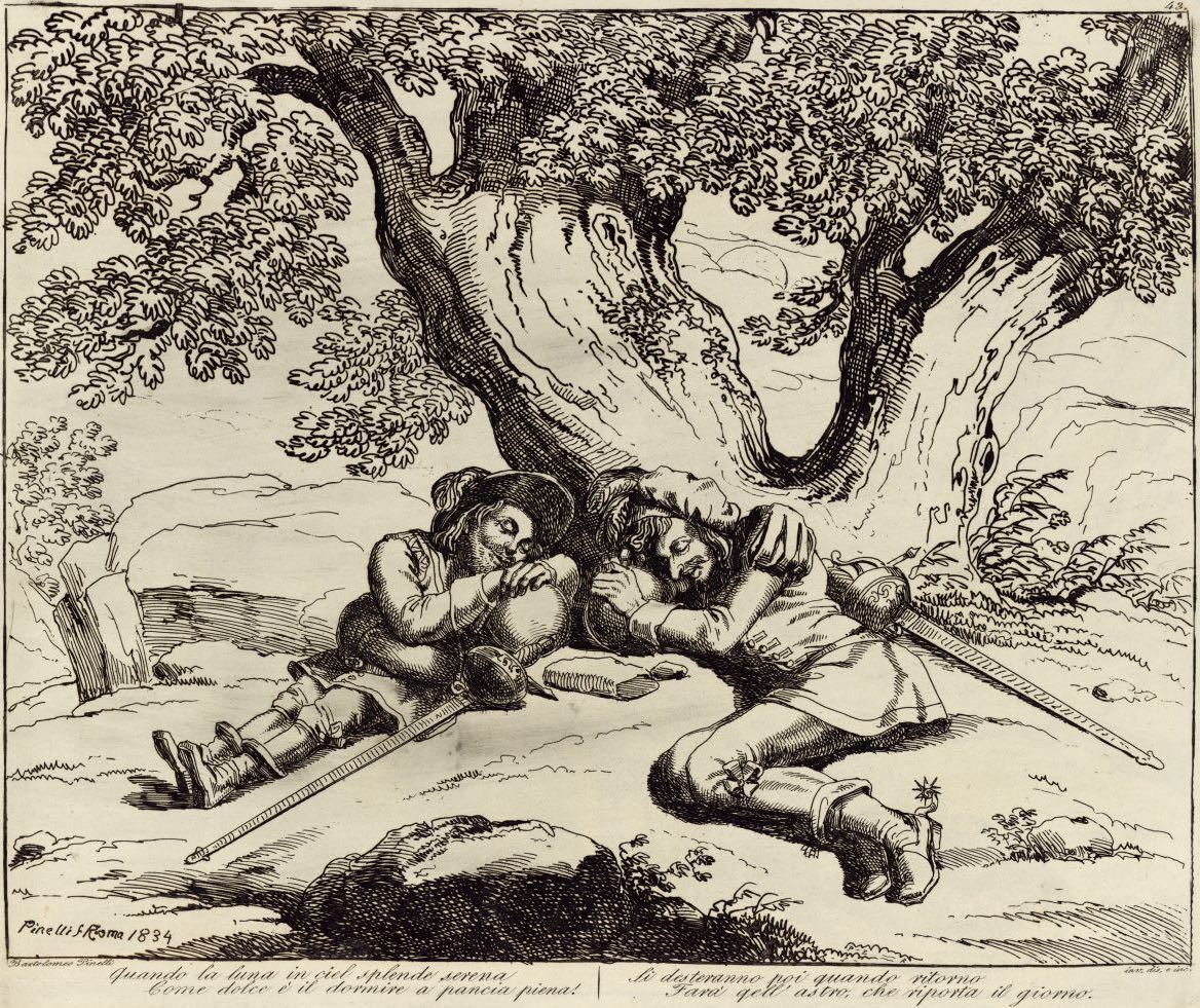 Sancho Panza and the Knight of the Mirrors’ squire (Tomé Cecial) sleep at the foot of a tree during the night before the duel. Each holds their flash in their arms. Signed by Bartolomeo Pinelli (engraver and illustrator) and dated Rome, 1833. Plate 43. Part 2, ch. 13.